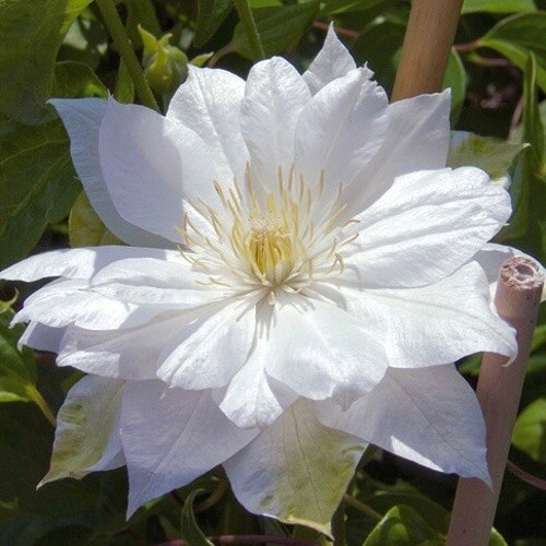 Этот клематис известен своими махровыми белыми цветками диаметром 10–13 см, раскрывающимися на побегах текущего и прошлого года. Лепестки образуют плотные «розетки» с кремовым оттенком в центре и нежно-зелёными внешними чашелистиками, а тычинки светло‑жёлтые, создавая мягкий контраст. Цветение начинается в позднюю весну и продолжается до начала лета, при правильном уходе возможен повторный пик в конце лета. Цветки располагаются густо на каждом побеге, формируя белый ковёр, который подчёркивает вертикальные конструкции в саду: шпалеры, арки или заборы. Такой клематис станет эффектным акцентом даже на небольшом участке, особенно в сочетании с декоративными кустарниками или розами.