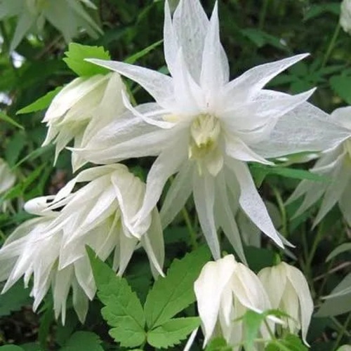 Листья тройчатые, зеленые, среднего размера. Декоративны весь сезон. Цветение начинается на 2–3 год. Период — май–июнь, продолжительность до 4 недель. Цветки колокольчатые, поникающие, диаметром 5–7 см. Окраска белая. Цветки густомахровые, создают выраженный декоративный эффект. Аромат слабый.