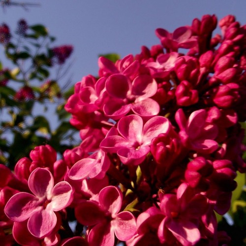 Бутоны насыщенно пурпурно-красные с бордовым отливом раскрываются в крупные махровые или полумахровые цветки диаметром 2,5–3 см. Соцветия пирамидальные, плотные, длиной 20–25 см, иногда более, смотрятся эффектно на фоне зелёной листвы. Цветение наступает во второй половине мая и продолжается около 2,5–3 недель, радуя обильными и стойкими соцветиями. Аромат сильный и пряный, легко ощущается даже на небольшом расстоянии, придавая саду живую, насыщенную атмосферу.