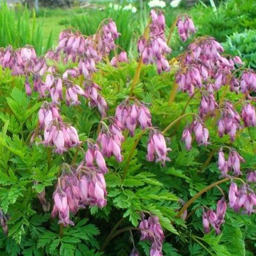 Главная особенность дицентры изящной — уникальные цветки в форме миниатюрных сердечек. Они собраны в изогнутые кисти длиной до 15 см. Оттенки — от лососево-розовых до насыщенно пурпурных. Цветение продолжается с конца мая до середины августа, а при благоприятных условиях — до сентября. Аромат отсутствует, зато визуальный эффект — выразительный и долгий.