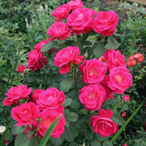 Цветение — главный козырь этого сорта. Период — с июня по сентябрь, волнами. Цветки чашевидные, полумахровые, диаметром 5–6 см, собраны в соцветия по 3–7 штук. На кусте одновременно раскрываются десятки бутонов, что создаёт мощный декоративный эффект. Цвет — насыщенный малиново-красный, со временем может слегка выгорать до розового, но это лишь добавляет оттеночной глубины. Аромат лёгкий, едва уловимый — не перебивает другие культуры в миксбордере.